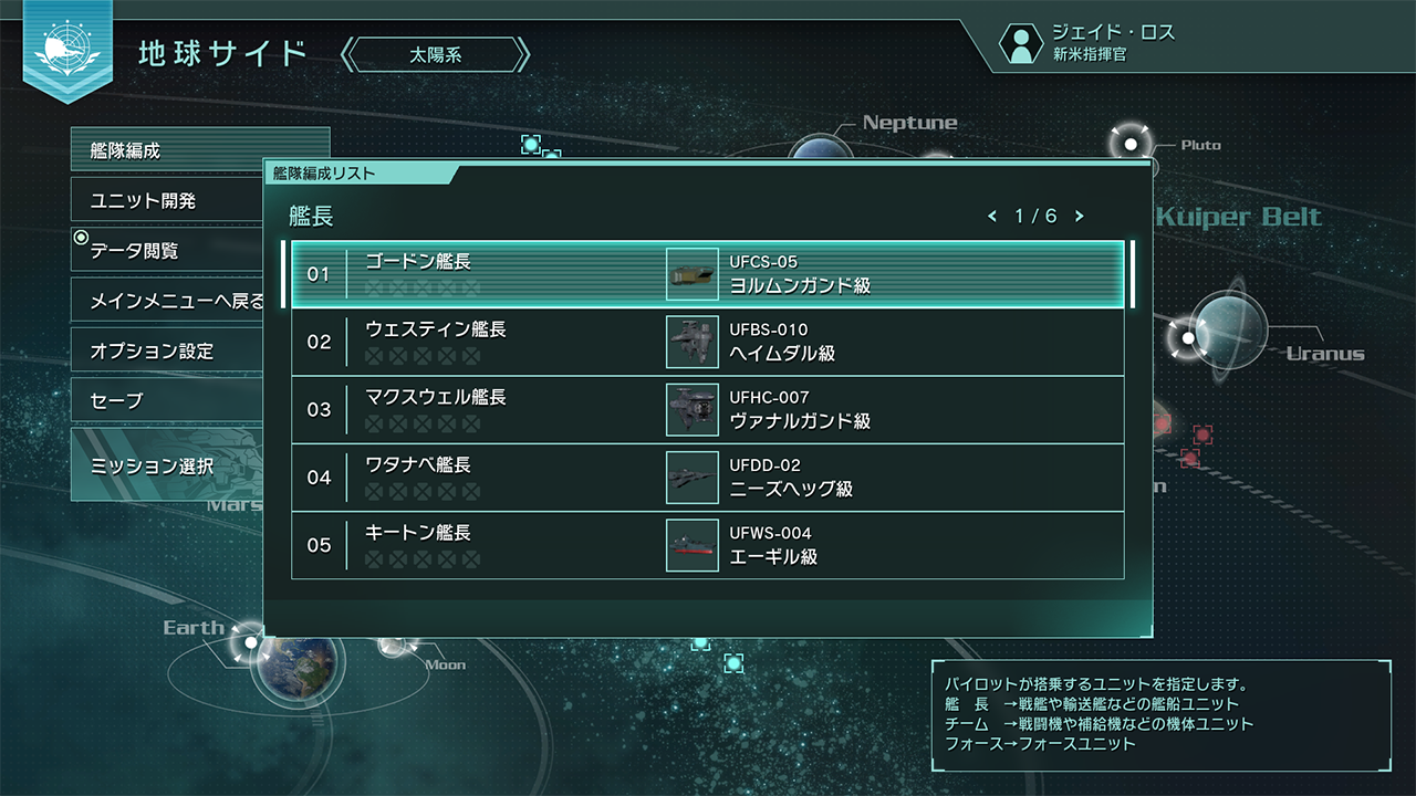 ユニットに乗せることができるパイロットのタイプはあらかじめ決まっており、艦船ユニットには艦長系パイロットを、機体ユニットにはチーム系パイロットを、フォースユニットにはフォース系パイロットシステムを乗せる必要があります。