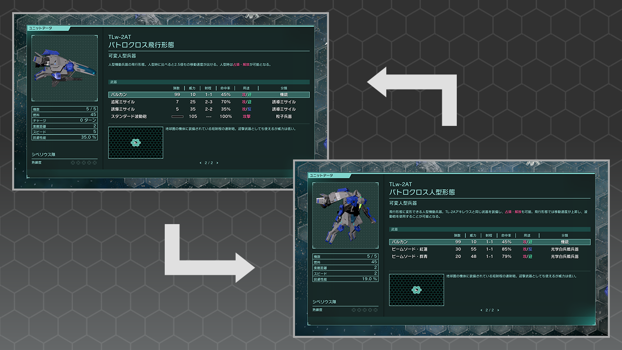 可変型のユニットの形態を変化させます。変形することで、攻撃時に使用できる武器や、移動速度などが変化します。