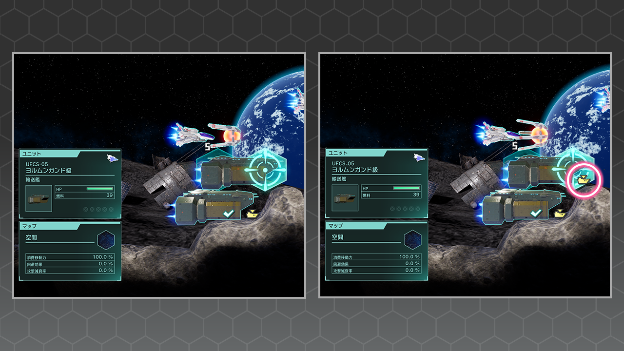 輸送艦のデコイが判別されないよう、ユニットが搭載されているように偽装することができます。