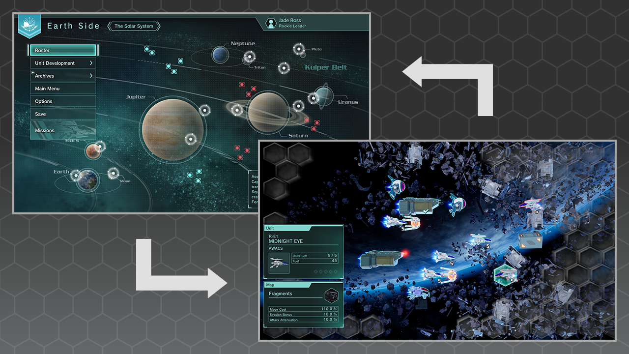 - 中场(准备和方针选择):进行舰队编成和单位开发,为战斗做准备。同时选择下一个任务。
